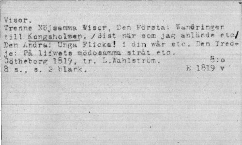 //// Visor. //// Trenne Nöjsamma , Der, Första: ringer- //// till Kongeholtieru /3ist när so»; ja?; anlände - etc/ Den Andra; Ur^tT Flicka! i dar» v/år etc. Hen Tredje: På lifwete mödosamma stråt etc. //// 3'otheborp; 1 Si 9 < tr. L.Wahl st rem . 8:0 //// 8 a., s. 5 blank. K l8l9 v ' ////