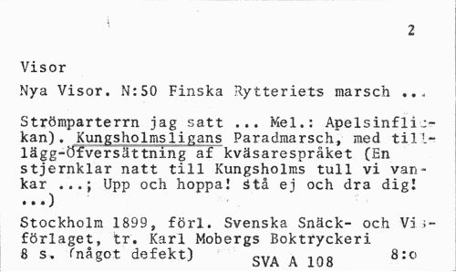 //// 2 //// Visor //// Nya Visor. N:50 Finska Rytteriets marsch ... //// Strömparterrn jag satt ... Mel.: Apelsinfli:-kan). Kungsholmsligans Paradmarsch, med till-lägg-öfversättning af kväsarespråket (En stjernklar natt till Kungsholms tull vi vankar ...; Upp och hoppal Stå ej och dra dig! • • •) //// Stockholm 1899, förl. Svenska Snäck- och Vii-förlaget, tr. Karl Mobergs Boktryckeri 8 s. fnågot defekt) SVA ^ jQg 8:o ////