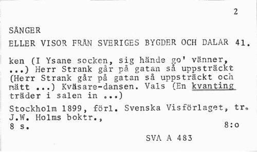//// 2 //// SÅNGER //// ELLER VISOR FRÅN SVERIGES BYGDER OCH DALAR 41. //// ken (I Ysane socken, sig hände go' vänner, ...) Herr Strank går på gatan så uppsträckt (Herr Strank går på gatan så uppsträckt och nätt ...) Kväsare-dansen. Vals (En kvanting träder i salen in „..) //// Stockholm 1899, förl. Svenska Visförlaget, tr» J.W. Holms boktr., //// 8 s. 8:o //// SVA A 4 83 ////