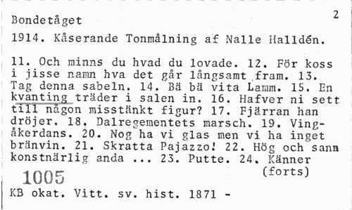 //// 2 //// Bondetåget //// 1914. Kåserande Tonmålning af Nalle Halidén. //// 11. Och minns du hvad du lovade. 12. För koss i jisse namn hva det går långsamt fram. 13. Tag denna sabeln. 14. Bä bä vita Lamm. 15. En kvanting träder i salen in. 16. Hafver ni sett. till någon misstänkt figur? 17. Fjärran han dröjer. 18. Dalregementets marsch. 19. Ving-1 åkerdans. 20. Nog ha vi glas men vi ha inget bränvin. 21. Skratta Pajazzo.' 22. Hög och sann konstnärlig anda ... 23. Putte. 24. Känner //// 1005 (forts) //// KB okat. Vitt. sv. hist. 1871 - ////