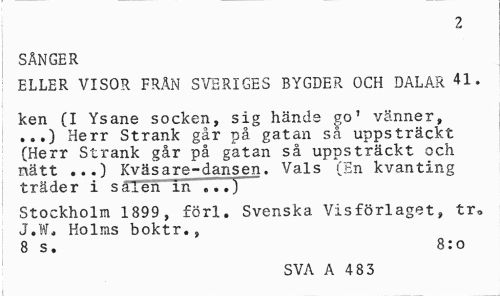 //// 2 //// SÅNGER //// ELLER VISOR FRÅN SVERIGES BYGDER OCH DALAR 41. //// ken (I Ysane socken, sig hände go' vänner, ...) Herr Strank går på gatan så uppsträckt (Herr Strank går på gatan så uppsträckt och nätt ...) Kväsare-dansen. Vals (En kvanting träder i salen in ...) //// Stockholm 1899, förl. Svenska Visförlaget, tr, J.W. Holms boktr., //// 8 s. 8:o //// SVA A 483 ////