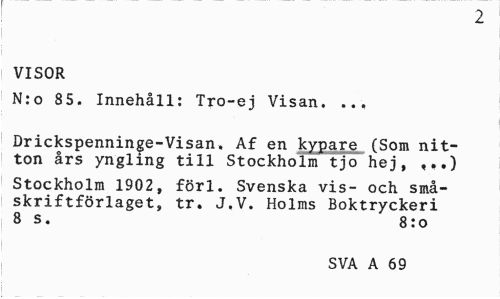 //// 2 //// VISOR //// N:o 85. Innehåll: Tro-ej Visan. ... //// Drickspenninge-Visan. Af en kypare (Som nitton års yngling till Stockholm tjo hej, ,..) //// Stockholm 1902, förl. Svenska vis- och små-skriftförlaget, tr. J.V. Holms Boktryckeri 8 s. 8:o //// SVA A 69 ////
