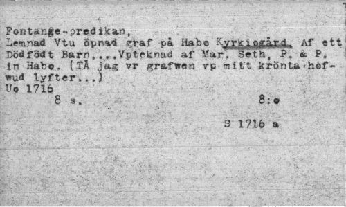 //// Fontange-predikan, //// Lemnad V tu Öp rad <rraf pa Habo Kvrk-i affäyrt Af ett Död föd t Barn t ...Vpteknad af Mar. Séth, P. k P. In Habo. (TÅ iag vr grafwen vp mitt krönta hof-wud lyfter...) Uo 1716 //// 8a. 8;» //// S 1716 a ////