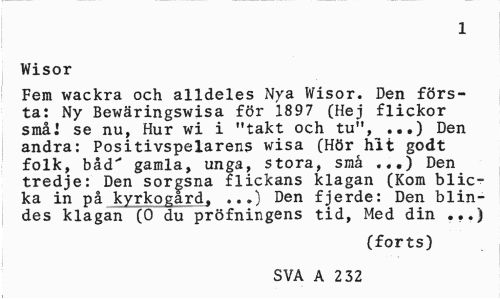 //// 1 //// Wisor //// Fem wackra och alldeles Nya Wisor. Den första: Ny Bewäringswisa för 1897 (Hej flickor småi se nu, Hur wi i "takt och tu", ...) Den andra: Positivspelarens wisa (Hör hit godt folk, båd' gamla, unga, stora, små ...) Den tredje: Den soresna flickans klagan (Kom blicka in på kyrkogård, ...) Den fjerde: Den blindes klagan (0 du pröfningens tid, Med din ...) //// (forts) //// SVA A 2 32 ////