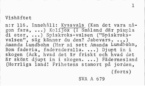 //// 1 //// Vishäftet //// n:r 116. Innehåll: Kyssvals (Kan det vara någon fara, ...) Kolijox (I Småland där pimpla di eter, ...) Spisxroks-valsen ("Spiskroksvalsen", säg känner du den? Jabevars. ...) Amanda Lundbohm (Har ni sett Amanda Lundbohm, Bom faderia, faderaderalla. ...) Djupt in i skogen (Ack, hvad det är friskt och hvad det är skönt djupt in i skogen. ...) Fädernesland (Herrliga land! Frihetens stamort på jorden, //// (forts) //// SVA A 2 79 ////