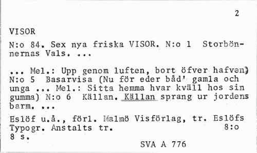 //// 2 //// VISOR //// N:o 84. Sex nya friska VISOR. N:o 1 Storbön-nernas Vals. ... //// ... Mel.: Upp genom luften, bort öfver hafven) N:o 5 Basarvisa (Nu för eder båd' gamla och unga ... Mel.: Sitta hemma hvar kväll hos sin gumma) N:o 6 Källan. Källan sprang ur jordens barm. ... //// Eslöf u.å., förl. Malmö Visförlag, tr. Eslöfs Typogr. Anstalts tr. 8:o //// 8 s . //// SVA A 776 ////