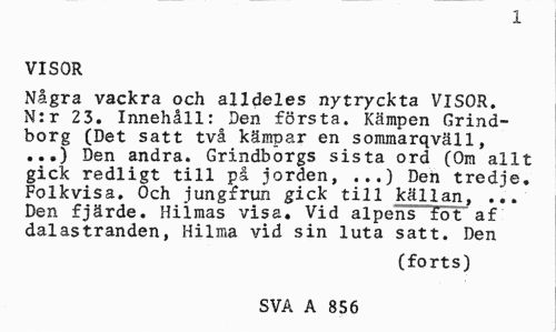 //// 1 //// VISOR //// Några vackra och alldeles nytryckta VISOR. N:r 23. Innehåll: Den första. Kämpen Grindborg (Det satt två kämpar en sommarqväll, ...) Den andra. Grindborgs sista ord (Om allt gick redligt till på jorden, ...) Den tredje. Folkvisa. Och jungfrun gick till källan, ... Den fjärde. Hilmas visa. Vid alpens fot af dalastranden, Hilma vid sin luta satt. Den //// (forts) //// SVA A 856 ////