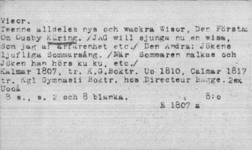 //// !/i«cr. //// Iwenne alldeles rys och wackra Wisor, Der Första: Cra Ousby Käring. /JaO wi 11 sjunga nu .er wisa, 5 cm ja?» a i "Erfarenhet etc,/ Den Andra: Jötcens ljuf li£» Sommar sång. /Kär Sommaren nalkas och Jöscen han hörs ku ku, etc./ //// vulmar l807, tr. X.S.Boktr. Uo 1810, Calmar 1817 //// tr. Kgl Gymnasii Bostr. h*s JJirecteur Ba^ge. //// L. •• >oca //// 8 s., s. £ och 8 blanka, « 8: c //// & 1Ö07 a ////