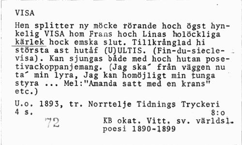//// VISA //// Hen splitter ny möcke rörande hoch ögst hyn-kelig VISA hom Frans hoch Linas holöckliga kärlek hock emska slut. Tillkrånglad hi största ast hutåf (U)ULTIS. (Fin-du-siecle- -visa). Kan sjungas både med hoch hutan pose-tivackoppanjemang. [Jag ska" från väggen nu ta" min lyra, Jag kan homöjligt min tunga styra ... Mel:"Amanda satt med en krans" etc.) //// U.o. 1893, tr. Norrtelje Tidnings Tryckeri 4 s. 8:0 //// nn KB okat. Vitt. sv. världsl. //// J ^ poesi 1890-1899 ////