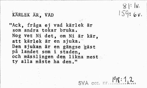 //// w. //// KÄRLEK ÄR, VAD °\'> (o M> //// "Ack, fråga ej vad kärlek är som andra tokar bruka. Nog vet Ni det, om Ni är kär, att kärlek är en sjuka. Den sjukan är en gängse gäst på landet som i staden, och mässlingen den likna mest ty alla måste ha den." //// SVA ccc. ////