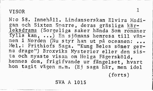 //// VISOR 1 //// N:o 58. Innehåll. Lindanserskan Elvira Madi-gan och Sixten Sparre, deras gräsliga kärleksdrama (Sorgeliga saker hända Som romaner fylla kan, ...) En sjömans hemresa till vännen i Norden (Nu styr han ut på oceanen; ... Mel.: Frithiofs Saga. "Kung Beles söner ger-na dragé") Broxviks Mysterier eller den sista och nyaste visan om Helga Fägersköld, hennes dom, frigifvande ur fängelset, hvart hon tagit vägen m.m. (Ej saga här, men idel //// (forts) //// SVA A 1015 ////