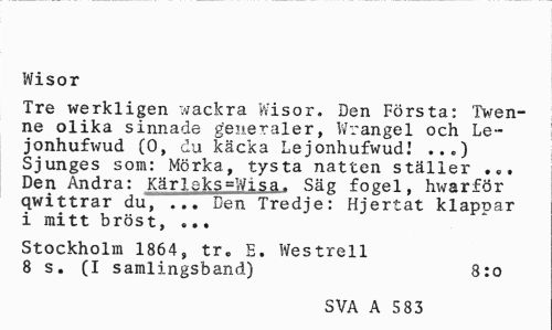 //// Wisor //// Tre werkligen wackra Wisor. Den Första: Twen-ne olika sinnade generaler, Wrängel och Le-jonhufivud (0, du käcka Lejonhufwud.' ...) Sjunges som: Mörka, tysta natten ställer Den Andra: Kärleks=Wisa. Säg fogel, hwarför qwittrar du, ... Den Tredje: Hjertat klappar i mitt bröst, ... //// Stockholm 1864, tr. E. Westrell 8 s. (I samlingsband) 8:o //// SVA A 5 83 ////