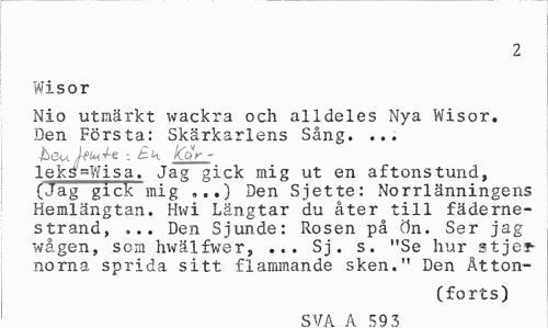 //// 2 //// Wisor //// Nio utmärkt wackra och alldeles Nya Wisor. Den Första: Skärkarlens Sång. ... //// heu : Bw ÅToV - //// leks-Wisa. Jag gick mig ut en aftonstund, (Jag gick mig ,..) Den Sjette: Norrlänningens Hemlängtan. Hwi Längtar du åter till fädernestrand, ... Den Sjunde: Rosen på Ön. Ser jag wågen, som hwälfwer, ... S j. s. "Se hur stjes-norna sprida sitt flammande sken." Den Åtton- //// (forts) //// Q \1 A A KQ1 ////