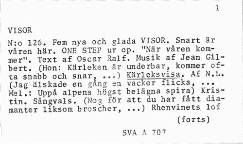 //// 1 //// VISOR //// N:o 126. Fem nya och glada VISOR. Snart är våren här. ONE STEP ur op. "När våren kommer". Text af Oscar Ralf. Musik af Jean Gil-bert. (Hon: Kärleken är underbar, kommer ofta snabb och snar, .,„) Kärleksvisa. Af N.L. (Jag älskade en gang en vacker flicka, ... Mel.: Uppå alpens högst belägna spira) Kris-tin. Sångvals. (Nog för att du har fått diamanter liksom broscher, ...) Rhenvinets lof //// (forts) //// SVA A 70 7 ////