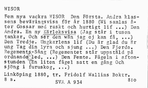//// WISOR //// Fem nya vackra WISOR Den Första. Andra klassens beväringsvisa för år 1880 (Wi samlas å-ter Gossar med raskt och hurtigt lif Sen //// Andra. En ny Kärleksvisa (Jag står i tusen tankar, Och sér den wän jag ej kan få, ...) Den Tredje. Ungkarlens lif (Du är glad du är ung Tag din lyra och sjung ...) Den Fjerde. Regements-Sång (Regementet står uppstäld på ordnandeQjLed, ...) Den Femte. Fågeln i aftonstunden (fen liten fågel satt en gång Och sjöng i furuskog, .o.) //// Linköping 1880, tr. Fridolf Wallins Boktr. 8 s# SVA A 934 8:0 ////