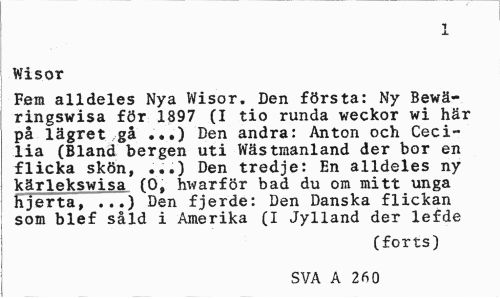 //// 1 //// Wisor //// Fem alldeles Nya Wisor. Den första: Ny Bewä-ringswisa för 1897 (I tio runda weckor wi här på lägret gå ..,) Den andra: Anton och Cecilia (Bland bergen uti Wästmanland der bor en flicka skön, ...) Den tredje: En alldeles ny kärlekswisa (0, hwarför bad du om mitt unga hjerta, ...) Den fjerde: Den Danska flickan som blef såld i Amerika (I Jylland der lefde //// (forts) SVA A 260 ////