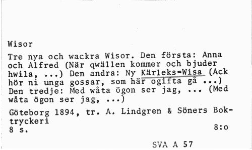 //// Wisor //// Tre nya och wackra Wisor. Den första: Anna och Alfred (När qwällen kommer och bjuder hwila, ...) Den andra: Ny Kärleks=Wisa (Ack hör ni unga gossar, som här ogifta gå ...) Den tredje: Med wåta ögon ser jag, ... (Med wåta ögon ser jag, ...) //// Göteborg 1894, tr. A. Lindgren & Söners Boktryckeri //// 8 s. 8:0 //// SVA A 5 7 ////
