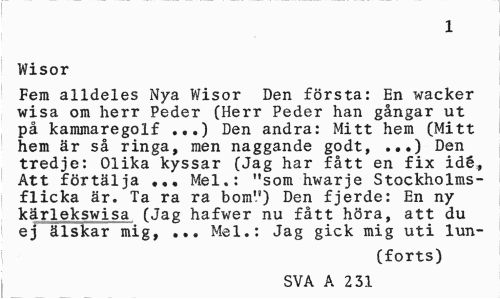//// 1 //// Wisor //// Fem alldeles Nya Wisor Den första: En wacker wisa om herr Peder (Herr Peder han gångar ut på kammaregolf ...) Den andra: Mitt hem (Mitt hem är så ringa, men naggande godt, ...) Den tredje: Olika kyssar (Jag har fått en fix idé, Att förtälja Mel.: "som hwarje Stockholmsflicka är. Ta ra ra bom") Den fjerde: En ny kärlekswisa (Jag hafwer nu fått höra, att du ej älskar mig, ... Mel.: Jag gick mig uti lun- //// (forts) //// SVA A 2 31 ////