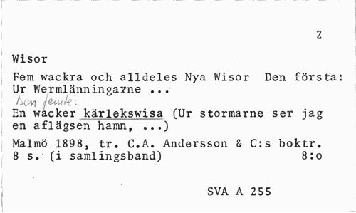 //// 2 //// Wisor //// Fem wackra och alldeles Nya Wisor Den första: Ur Wermlänningarne ... //// hovi k-. //// En wacker kärlekswisa (Ur stormarne ser jag en aflägsen hamn, ...) //// Malmö 1898, tr. C.A. Andersson & C:s boktr. 8 s. (i samlingsband) 8:o //// SVA A 255 ////