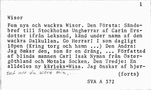 //// 1 //// Wisor //// Fem nya och wackra Wisor. Den Första: Sände-bref till Stockholms Ungherrar af Carin Ers-dotter ifrån Leksand, känd under namn af den wackra Dalkullan. Go Herrar! I som dagligt löpen (Kring torg och hamn ...) Den Andra: Jag ömkar den, som är en dräng, ... Författad af blinda mannen Carl Isak Nyman från öster-göthland och Motala Socken,. Den Tredje: En alldeles ny kärleks=Wisa. Jag önskar af hjer- //// </<* vOOre , . • (forts) //// SVA A 372 ////