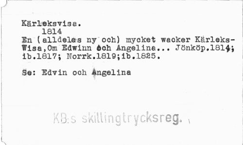 //// Kärleksvisa. 1814 //// En (alldeles ny och) mycket wacker Kärleks-Wisa,Om Edwinn éch Ångelina... Jönköp.181^', ib.1817; Norrk.1819;ib.1885. //// Se: Edvin och Ångelina //// K8:s skillingtrycksreg. * ////