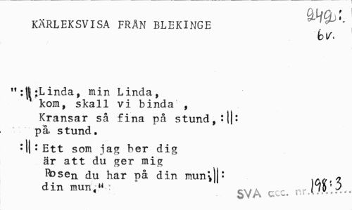 //// MW. //// KARLEKSVISA FRÄN BLEKINGE , //// b/- //// ":||;Linda, min Linda, //// kom, skall vi binda , Kransar så fina på stund, på stund. //// ;l|*Ett som iag ber dig är att du ger mig //// Rosen. du har på din mun>|J: iAff.2 //// din mun/4 r ,.7P. 1A - ////