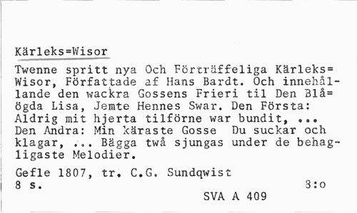 //// Kärleks=Wisor //// Twenne spritt nya Och Förträffeliga Kärleks= Wisor, Författade af Hans Bardt. Och innehållande den wackra Gossens Frieri til Den 31å= ögda Lisa, Jemte Hennes Swar. Den Första: Aldrig mit hjerta tilförne war bundit, ... Den Andra: Min käraste Gosse Du suckar och klagar, ... Bägga twå sjungas under de behagligaste Melodier. //// Gefle 1807, tr, C.G, Sundqwist 8 s. 3: o //// SVA A 409 ////