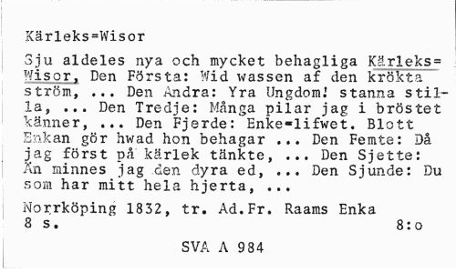 //// Xärleks=Wisor //// Sju aldeles nya och mycket behagliga Kärleks= Wisor, Den Första: Wid wassen af den krökta ström, ... Den Andra: Yra Ungdom.' stanna stilla, ... Den Tredje: Många pilar jag i bröstet känner, ... Den Fjerde: Enke-lifwet. Blott Enkan gör hwad hon behagar ... Den Femte: Då jag först på kärlek tänkte, ... Den Sjette: An minnes jag den dyra ed, ... Den Sjunde: Du som har mitt hela hjerta, ... //// Norrköping 1832, tr. Ad.Fr. Raams Enka 8 s. 8:0 //// SVA A 9 84 ////