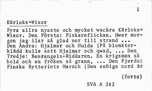 //// 1 //// Kärleks=Wisor //// Fyra allra nyaste och mycket wackra Kärleks® Wisor* Den Första: Fiskareflickan. Hwar morgon jag ilar så glad ner till strand ... Den Andra: Hjalmar och Hulda (På blomsterklädd kulle satt Hjalmar och qwad, ... Den Tredje: Benrangels-Riddaren. En krigsman så bold och en fröken så grann, ... Den Fjerde: Finska Rytteriets Marsch (Den snöiga nord är //// (forts) //// SVA A 24 2 ////