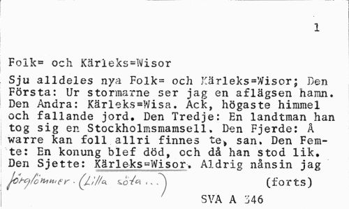 //// 1 //// Folk= och Kärleks=Wisor //// Sju alldeles nya Folk= och Kärleksvisor; Den Första: Ur stormarne ser jag en aflägsen hamn. Den Andra: Kärleks=Wisa. Ack, högaste himmel och fallande jord. Den Tredje: En landtman han tog sig en Stockholmsmamsell. Den Fjerde: Ä warre kan foll allri finnes te» san. Den Femte: En konung blef död, och då han stod lik. Den Sjette: Xärleks=Wisor. Aldrig nånsin jag //// Johj/(>yuin>er • (il//o. so A .. (forts) //// SVA A 346 ////
