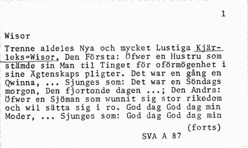 //// 1 //// Wisor //// Trenne aldeles Nya och mycket Lustiga Kiär-lekssWisor. Den Första: öfwer en Hustru som stämde sin Man til Tinget för oförmögenhet i sine Ägtenskaps pligter. Det war en gång en Qwinna, ... Sjunges som: Det war en Söndags morgon, Den fjortonde dagen ...; Den Andra: öfwer en Sjöman som wunnit sig stor rikedom och wil sätta sig i ro. God dag God dag min Moder, ... Sjunges som: God dag God dag min //// (forts) //// SVA A 87 ////