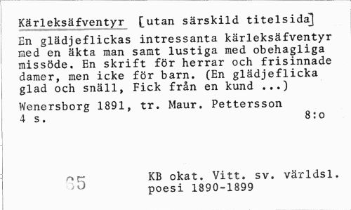 //// Kärleksäfventyr £utan särskild titelsida] //// En glädjeflickas intressanta kärleksäfventyr ned en äkta man samt lustiga med obehagliga missöde. En skrift för herrar och frisinnade damer, men icke för barn. (En glädjeflicka glad och snäll, Fick från en kund ...) //// Wenersborg 1891, tr. Maur. Pettersson j 4 s. 8: o //// r> rr KB okat. Vitt. sv. världsl. //// poesi 1890-1899 ////