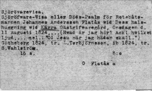 //// Sjörövarevisa. //// Sjöröfware-Wisa ells* Dods-Psalm för Rstebåts-mannen J»hannes Anderssen Flatas wid Dess hals- //// hu^ninjf wid Käj^a Oäst^ifware^ård, Onsdagen d. 11 Augusti 1824,. :"(Hwad är jag hör? Ack I hwilket ljud,... mel.; "01 Jesu när jag hädan skall.*) Tötheberg 1824, tr. L.TerbjcT^nssen, ib 1624, tr. S.Wahlstro». //// 16 s. 8;o //// O Flatas a ////
