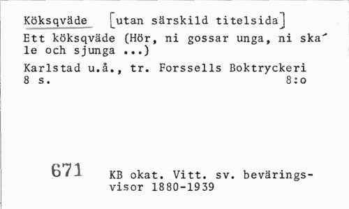//// Köksqväde [utan särskild titelsi da] //// Ett köksqväde (Hör, ni gossar unga, ni ska'' le och sjunga ...) //// Karlstad u.å., tr. Forssells Boktryckeri 8 s. 8:0 //// 671 KB okat. Vitt. sv. bevärings-visor 1880-1939 ////