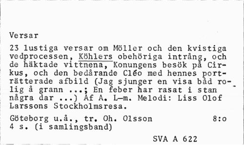 //// Versar //// 23 lustiga versar om Möller och den kvistiga vedprocessen, Köhlers obehöriga intrång, och de häktade vittnena, Konungens besök på Cirkus, och den bedårande Cléo med hennes porträtterade afbild (Jag sjunger en visa båd ro-_ lig å grann .,.; En feber har rasat i stan några dar ...) Af A. L-m. Melodi: Liss Olof Larssons Stockholmsresa. //// Göteborg u.å., tr. Oh. Olsson 8:0 //// 4 s. (i samlingsband) //// SVA A 622 ////