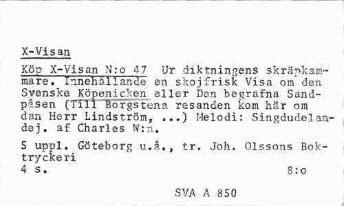 //// X-Vi san //// Kop X-Visan N:o 4 7 Ur diktningens skräpkammare . Innehållande en skoj frisk Visa om den Svenske Köpenicken eller Den begrafna Sandpåsen (Till Borgstena resanden kom här om dan Herr Lindström, ...) Melodi: Singdudelande j. af Charles W:n. //// 5 uppl. Göteborg u.å., tr. Joh. Olssons Boktryckeri //// 4 s. S:o //// SVA A 850 ////