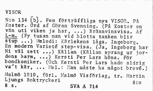 //// VISOR //// N:o 134 [b]. Fem förträffliga nya VISOR. På Koster. Ord af Göran Svenning. (På Kostsr en vän uti viken ja har, ...) Brännvinsvisa. Af L-m. (Fy tusan man vid blotta tanken blir stup ...) Melodi: Kärlekens låga. Ingeborg. En modern Varieté step-visa. (Ja, Ingeborg har Ni väl sett ...) Källan (Källan sprang ur jordens barm, ...) Kersti Per Lars höna. För bondkomiker. (Och Kersti Per Lars hade aldrig va"*t kär, ... Mel.: Man måste ha något brevé.) //// Malmö 1910, förl. Malmö Visförlag, tr., Martin Ljungs Boktryckeri g.0 //// 8 s. SVA A 714 ////