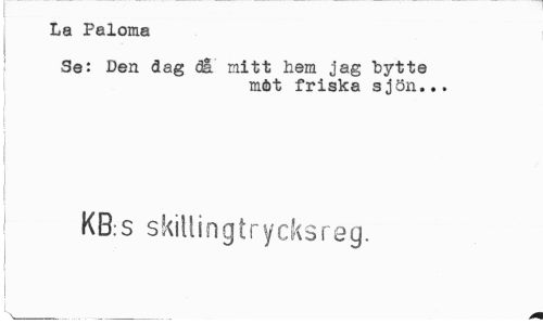 //// La Paloma //// Se: Den dag da mitt hem jag "bytte //// möt friska sjön... //// j //// KB:S skillingtrycksreg. ////