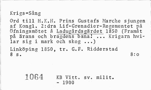 //// Krigs=Sång //// Ord till H.K.H. Prins Gustafs Marche sjungen af Kongl. 2:dra Lif-Grenadier-Regementet på öfningsmötet å Ladugårdsgärdet 1850 (Framåt på ärans och bragdens banal ... Krigarn hwi-lar sig i mark och skog ...) //// Linköping 1850, tr. G.F. Ridderstad 8 s. 8: o //// 1084 KB Vitt. sv. milit. //// - 1900 ////