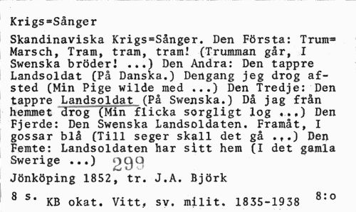 //// Krigs»Sånger //// Skandinaviska Krigs=Sånger. Den Första: T rum» Marsch, Tram, tram, tram! (Trumman går, I Swenska bröder! ...) Den Andra: Den tappre Landsoldat (På Danska.) Dengang jeg drog af-sted (Min Pige wilde med ...) Den Tredje: Den tappre Landsoldat (På Swenska.) Då jag från hemmet drog (Min flicka sorgligt log ,.,) Den Fjerde: Den Swenska Landsoldaten. Framåt, I gossar blå (Till seger skall det gå .,.) Den Femte: Landsoldaten har sitt hem (I det gamla Swerige ...) OQQ //// Jönköping 1852, tr. J.A. Björk //// 8 s* KB okat. Vitt, sv. milit. 1835-1938 8:0 ////