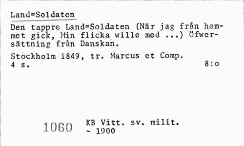 //// Land*Soldaten //// Den tappre Land=Soldaten (När jag från hemmet gick, Min flicka wille med ...) öfwer-sättning från Danskan. //// Stockholm 1849, tr. Marcus et Comp. 4 s. 8:0 //// inon KB Vitt. sv. milit. //// lUbu .. 1900 ////