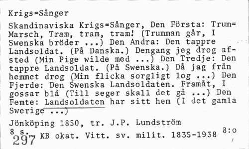 //// Krigs=Sånger //// Skandinaviska Krigs»Sånger, Den Första: Trum= Marsch, Tram, tram, trami (Trumman går, I Swenska bröder ...) Den Andra: Den tappre Landsoldat. (På Danska.) Dengang jeg drog af-sted (Min Pige wilde med ...) Den Tredje: Den tappre Landsoldat. (På Swenska.) Då jag från hemmet drog (Min flicka sorgligt log ...) Den Fjerde: Den Swenska Landsoldaten. Framåt, I gossar blå (Till seger skall det gå ...) Den Femte: Landsoldaten har sitt hem (I det gamla Swerige 777) ~ //// Jönköping 1850, tr. J.P. Lundström //// 89Q7 KB okat. Vitt. sv. milit. 1835-1938 8:0 ////