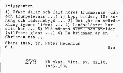 //// Krigsmannen //// 1) öfwer dalar och fält höres trummornas (dån och trumpeternas ...) 2) Upp, bröder, för konung och fädernebygd ... 3) Det går en swärds-klang igenom lifwet ... 4) Landsoldaten har sitt hem ... 5) Wid månans sken, som "sprider (silfrets glans ...) 6) En krigsman är en Christen man ... //// Skara 1846, tr. Peter Hedenius 8 s. 8:o //// 279 KB okat. Vitt. sv. milit. //// 1835-1938 ////