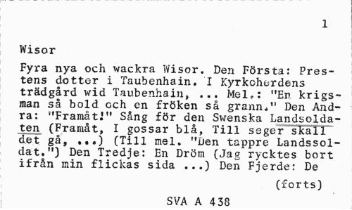 //// 1 //// Wisor //// Fyra nya och wackra Wisor. Den Första: Pres-tens dotter i Taubenhain. I Kyrkoherdens trädgård wid Taubenhain, ... Mel,: "En krigsman så bold cch en fröken så grann*" Den Andra: "Framåt.1" Sång för den Swenska Landsoldaten (Framåt, I gossar blå. Till seger skall det gå, ..«) (Till mel. "Den tappre Landssoldat.") Den Tredje: En Dröm (Jag rycktes bort ifrån min flickas sida ...) Den Fjerde: De //// (forts) //// SVA A 4 38 ////