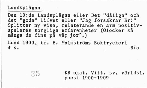 //// Landsplågan //// Den 10:de Landsplågan eller Det "dåliga" och det "goda" lifvet eller "Jag försäkrar Er I" Splitter ny visa, relaterande en arm positivspelares sorgliga erfarenheter (Olöcker så många de fins pa vå? Jor".) //// Lund 1900, tr. E. Malmströms Boktryckeri //// 4 s. 8:o //// 05 KB okat. Vitt. sv. världsl. //// poesi 1900-1909 ////
