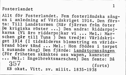//// 1 //// Fosterlandet //// Allt för Fosterlandet. Fem fosterländska sången i anledning af Världskriget 1914. Den första: Till Landstormen (När fjärran från öster De krigiska röster ...) Den andra: Riddarpoj-karna (Vi äro riddarpojkar vi ... Mel.: Marschen går till Tuna ) Den tredje: Världskriget 1914 (I tidsålderns blomstring en världsbrand blev tänd ... Mel.: Hon föddes i torpet i susande skog) Den fjärde: Landstormssången (För friheten skänktes oss wapen, kamrater ... Mel.: Engelbrektsmarschen) Den femte: Då //// 357 (forts) //// KB okat. Vitt. sv. milit. 1835-1938 ////