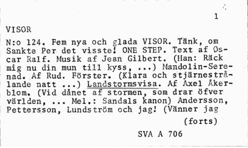 //// 1 //// VISOR //// N:o 124. Fem nya och glada VISOR. Tänk, om Sankte Per det visste! ONE STEP. Text af Oscar Ralf. Musik af Jean Gilbert. (Han: Räck mig nu din mun till kyss, ...) Mandolin-Serenad. Af Rud. Förs ter. (Klara och stjärnestrålande natt ...) Landstormsvisa. Af Axel Åkerblom. (Vid dånet af stormen, som drar öfver världen, ... Mel.: Sandals kanon) Andersson, Pettersson, Lundström och jagi (Vänner jag //// (forts) //// SVA A 706 ////