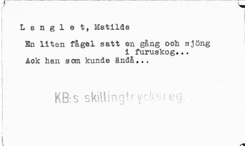 //// L a n g 1 e t, Matilda //// | En liten fågel satt en gång och sjöng //// i furuskog... Ack han som kunde ändå... //// K8:s skillinatrycksr eg //// 1 ////