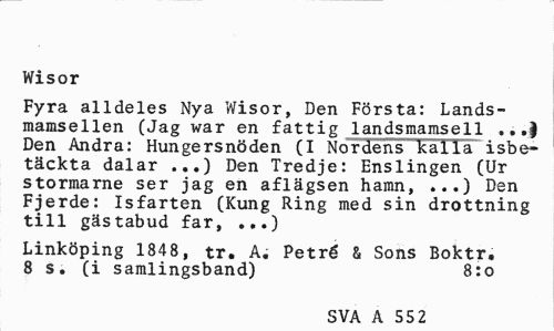 //// Wisor //// Fyra alldeles Nya Wisor, Den Första: Lands-mamsellen (Jag war en fattig landsmamsell .. Den Andra: Hungersnöden (I Nordens kalla isbe-täckta dalar ...) Den Tredje: Enslingen (Ur stormarne ser jag en aflägsen hamn, ...) Den Fjerde: Isfarten (Kung Ring med sin drottning till gästabud far, ...) //// Linköping 1848, tr. A. Petré & Sons Boktr. 8 s. (i samlingsband) 8:0 //// SVA A 55 2 ////