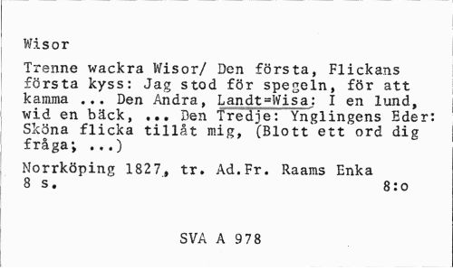 //// Wisor //// Trenne wackra Wisor/ Den första, Flickans första kyss: Jag stod för spegeln, för att kamma ... Den Andra, Landt=Wisa: I en lund, wid en bäck, ... Den TredjefYnglingens Eder: Sköna flicka tillåt mig, (Blott ett ord dig fråga; ...) //// Norrköping 1827, tr. Ad.Fr. Raams Enka 8 s. 8:0 //// SVA A 978 ////